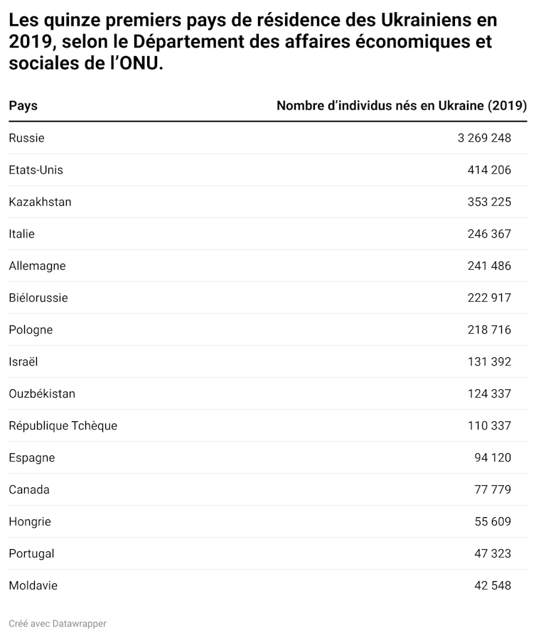 Avant l’afflux de réfugiés provoqué par la guerre de 2022, la France comptait officiellement 18 000 individus nés en Ukraine. D’autres États possèdent des populations d’origine ukrainienne bien plus nombreuses. Les quinze États regroupant le nombre le plus important d’Ukrainiens – en termes de pays de naissance et non d’auto-identification nationale – peuvent être répartis en trois catégories.