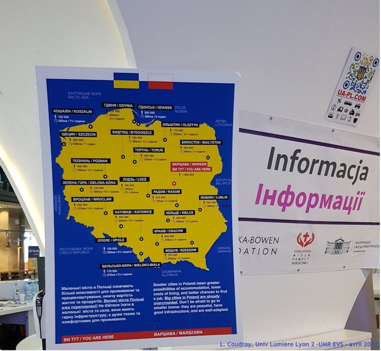 À court terme, le défi que doivent résoudre les autorités et les organisations humanitaires est l’hébergement. Elles visent tout d’abord une meilleure répartition des réfugiés dans le territoire : les flux ont convergé vers les grandes villes, au marché immobilier extrêmement tendu, alors que de nombreuses villes moyennes offrent des conditions de vie et d’emploi tout aussi intéressantes. Tel est le message qui s’affiche dans la gare centrale de Varsovie :
