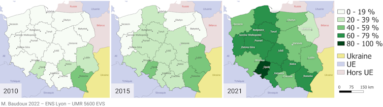 Quoi qu’il en soit, à mesure que la population ukrainienne s’installe dans l’espace polonais, elle s’éloigne de ses bases traditionnelles que constituait la bande frontalière, pour investir toutes les voïvodies – les régions du pays –, au point de constituer dans certaines d’entre elles 80 % des étrangers résidant de manière temporaire ou permanente en 2021, comme dans la région d’Opole dans le Sud-Ouest du pays.