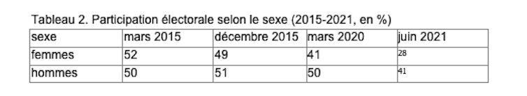 Tableau 2. Participation électorale selon le sexe (2015-2021, en %)