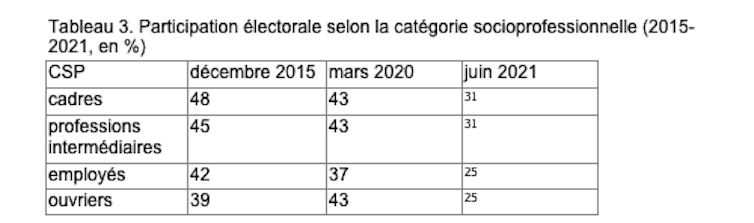 Tableau 3. Participation électorale selon la catégorie socioprofessionnelle (2015-2021, en %)