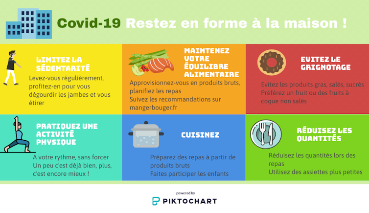 Ces contraintes, combinées avec le respect scrupuleux des gestes barrières, sont indispensables pour enrayer la progression de l’épidémie et protéger les personnes vulnérables. Dans ces circonstances exceptionnelles, il est plus que jamais indispensable de ne pas oublier les comportements destinés à rester en bonne santé sur le long terme. En plus de ce que nous pouvons faire pour notre santé mentale et celle des autres, il faut en particulier adapter nos comportements alimentaires et notre activité physique à ce nouveau mode de vie.