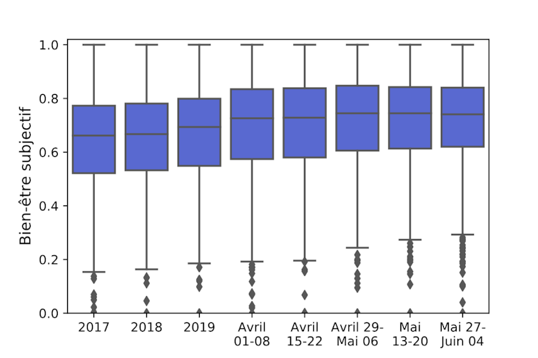 Fait remarquable, l’adhésion à ces perceptions positives du confinement est restée quasiment la même au début et à la fin des 55 jours au cours desquels nous avons effectué cette mesure. Les indicateurs de bien-être montrent une corrélation positive avec la fréquence de sortie pendant la période ; une certaine flexibilité de la contrainte de confinement semble donc avoir préservé l’équilibre individuel.