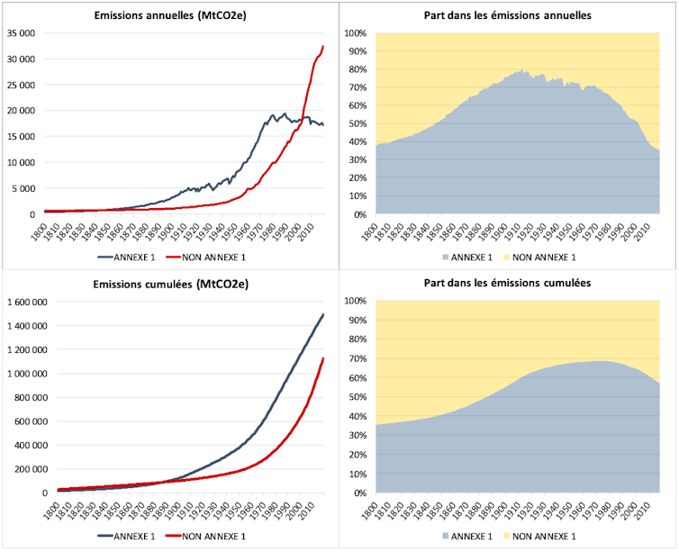 L’examen des émissions annuelles fait apparaître une rupture dans les pays Annexe 1 à partir de 1980 (le second choc pétrolier), avec depuis une décroissance lente. En revanche, pour les pays Non-Annexe 1, elles n’ont cessé d’augmenter, et de manière exponentielle. Résultat : si, en 1980, les émissions des pays industrialisés représentaient deux fois celles du groupe « pays en développement + Chine », cette proportion est aujourd’hui inversée.