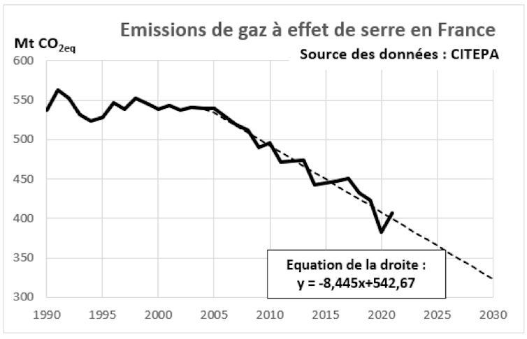La SNBC héritée du précédent quinquennat reste calée sur l’objectif intermédiaire de -40 % en 2030. Les décisions de la justice française donnant raison à des ONG environnementales dans le cadre de « l’affaire du siècle » portaient sur le retard pris au début du quinquennat sur cet objectif. Un retard rattrapé depuis, avec l’aide des confinements imposés par le Covid. En revanche, aucune accélération du rythme de décarbonation de l’économie n’a eu lieu. Après le reflux de 2020, les émissions ont rejoint en 2021 la tendance détectable depuis 2005 qui ne conduit pas à une baisse de 55 % en 2030.