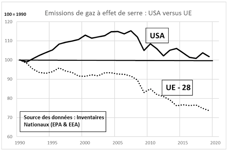 Cela représenterait un effort d’ici 2030 d’un ordre de grandeur comparable à la baisse de 55 % relativement à 1990 désormais visée par l’UE (voir le graphique ci-dessous).