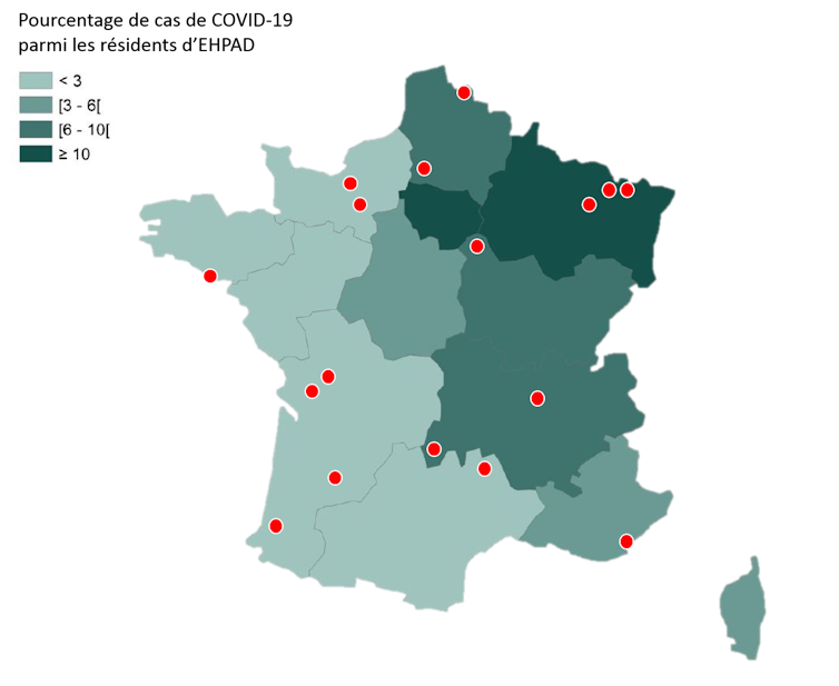 Intrigués par cette expérience, nous avons découvert qu’elle n’était pas restée isolée : 16 autres Ehpad ont en effet suivi une démarche analogue. Nous avons alors contacté leurs responsables pour les interroger sur les caractéristiques de leur établissement, les modalités de leur autoconfinement, et le nombre de cas de Covid-19 survenus du 1er mars au 28 avril.