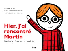 Hier j’ai rencontré Martin est un album de jeunesse qui propose deux niveaux de lecture. La page de droite présente un dessin simple ainsi qu’un texte court adapté aux enfants alors que la page de gauche est une explication plus longue destinée à l’adulte qui permet d’expliciter les manifestations du handicap, ici l’autisme. L’histoire suit une journée-type pour Hector, le personnage principal, du matin jusqu’au soir, montrant ses besoins ainsi que les aménagements qui sont faits pour lui permettre de gérer les stimulations sensorielles (musique, répétitions, horaires fixes, décomptes, etc.). L’illustration est en noir et blanc avec des touches de marron (pour les cheveux d’Hector, ce qui permet de l’identifier rapidement sur l’image) et de rouge, ce qui fait apparaître les détails sur lesquels se focalise le protagoniste.
