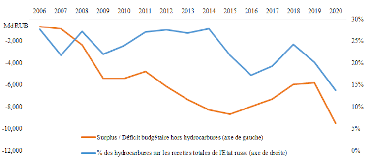 Les énergies fossiles jouent un rôle fondamental dans l’équilibre budgétaire russe (23 % des recettes du pays en moyenne depuis 2006). Sans les fonds issus des énergies fossiles, aucun budget annuel du pays n’aurait été à l’équilibre depuis 2006. Les exportations de gaz (37 % de la production) constituent donc une source de revenus indispensable à l’équilibre budgétaire russe.