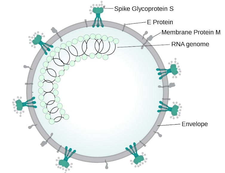 Le matériel génétique du coronavirus SARS-CoV-2 est un ARN positif monocaténaire (ssRNA). Cet ARN code pour quatre protéines structurelles : épine (spike, S), enveloppe (envelope, E), membrane (membrane, M) et nucléocapside (nucleocapsid, N).