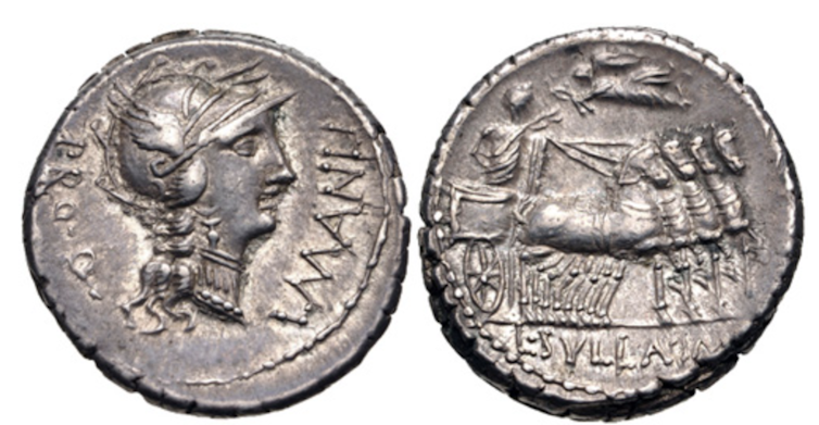 Sylla triomphant, debout sur un char tiré par quatre chevaux. Monnaie de Sylla, 82-81 av. J.-C.