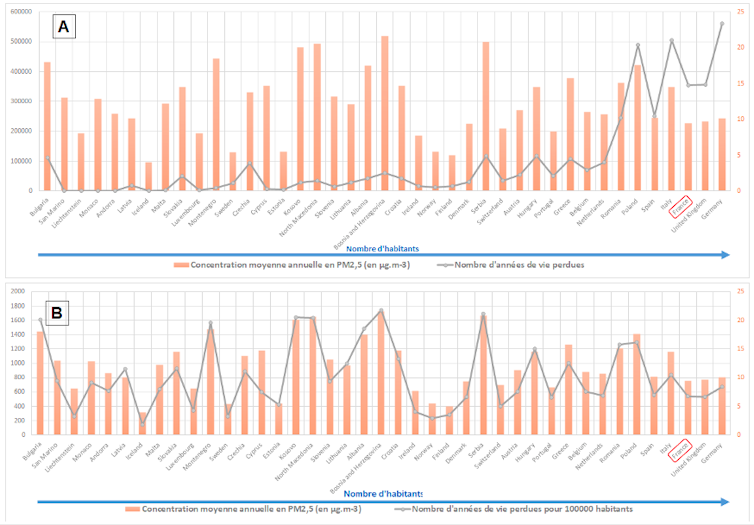 Figure 1 : Nombre d’années de vie perdues attribuables à l’exposition aux PM₂.₅ en 2019 dans 41 pays européen (A), rapporté aux nombres d’habitants (B).