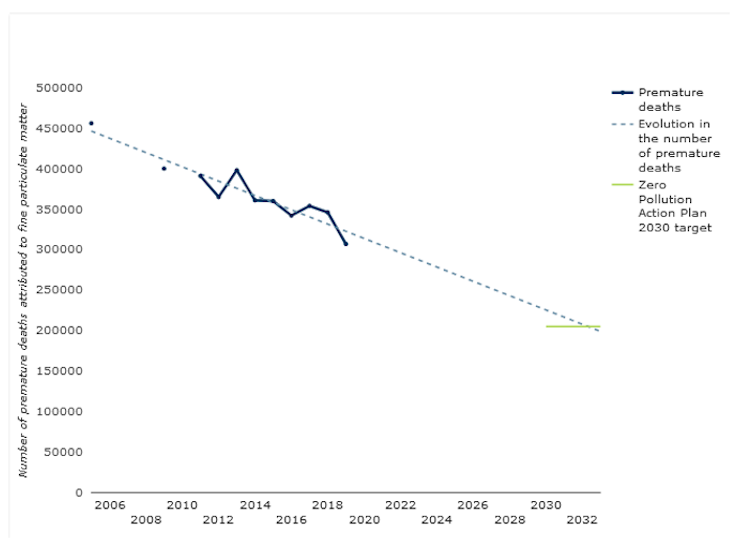 Figure 2 : Nombre de décès prématurés attribuables aux PM₂.₅ en Europe (UE-27) sur la période 2005-2019 et distance jusqu’à la cible de 55 % de réduction depuis 2005.