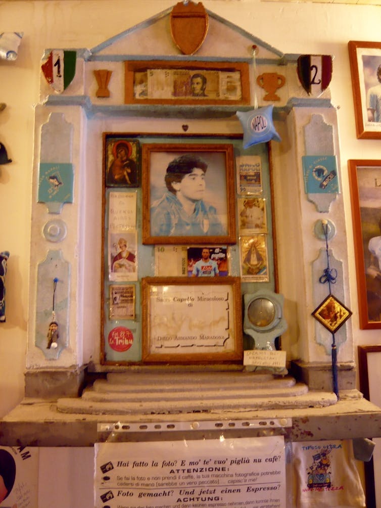 Signe de cette dévotion, les objets qu’il a touchés sont pieusement conservés. Le fils de l’ancien gardien des vestiaires du stade a consacré un musée à l’idole dans le sous-sol de l’immeuble où il vit, dans un quartier populaire de Naples. Y figure en bonne place la cafetière qu’utilisait l’épouse du gardien, la mère de notre collectionneur, pour préparer le café de Maradona. Symbole encore plus coruscant de ce culte dont la parodie n’est pas absente : installé dans un bar du centre-ville, un autel à la gloire de Maradona, comportant une relique (un cheveu prélevé sur le dossier d’un avion). La fusion entre Naples et Maradona demeure donc totale.