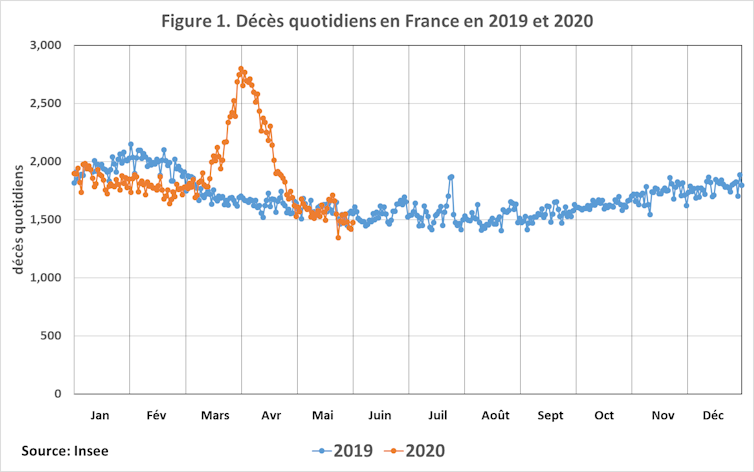 En comparant les décès quotidiens de 2020 à ceux de 2019 sur la même période, on observe que l’épidémie de COVID-19 a généré une forte surmortalité concentrée sur les mois de mars et avril.