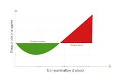 Le risque de survenue d’un infarctus du myocarde suit également une telle courbe. C’est une des raisons qui poussent certains à continuer à faire la promotion de l’alcool, et du vin en particulier, sur le mode « consommé modérément le vin, c’est bon pour le cœur ». Mais ce raccourci est problématique, car la courbe en J reflète en effet une tendance globale, valable à l’échelle d’une population donnée. Les conséquences de la consommation d’alcool pour un individu particulier peuvent être sensiblement différentes, car chacun peut présenter ou non d’autres facteurs de risque et/ou de protection.