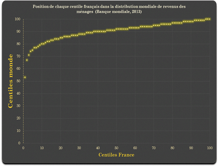 Pour la France, les données de la Banque mondiale montrent que 62 % des Français appartiennent aux 10 % les plus riches du monde.