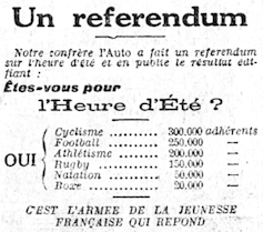 Des pétitions circulent mobilisant des élus locaux, des offices agricoles, des chambres de commerce, des industriels, des syndicats d’initiative, des médecins, des curés et même des sportifs. Certains vont jusqu’à accuser l’heure d’été d’être responsable de l’augmentation de la mortalité infantile, de rendre les femmes « mauvaises nourrices », d’être une mesure de débauche soutenue par les « bistrots et les dancings ».