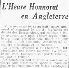 En France, le député Honnorat introduit alors l’idée du changement d’heure annuel tel qu’on le connaît aujourd’hui, en vue de pouvoir bénéficier d’une heure de lumière naturelle supplémentaire. Cette mesure destinée à dégager quelques millions de plus pour la victoire semble bien plus efficace pour faire des économies d’énergie qu’un couvre-feu dont il est difficile de surveiller l’application dans tous les recoins du territoire national.
