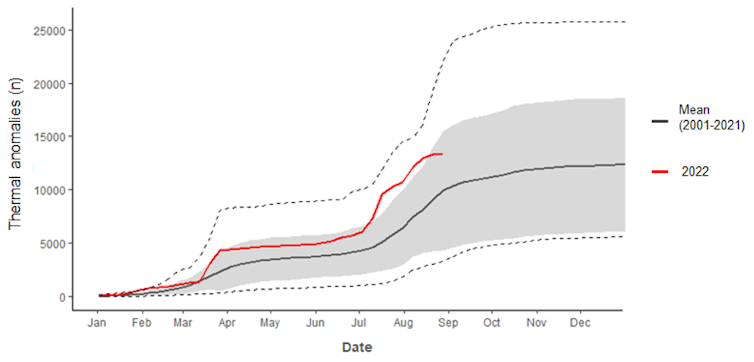 De juin à août 2022, des vagues de chaleur persistantes ont touché certaines parties du Nord-Ouest et du Centre de l’Europe, pulvérisant des records de température et favorisant l’activité des feux.