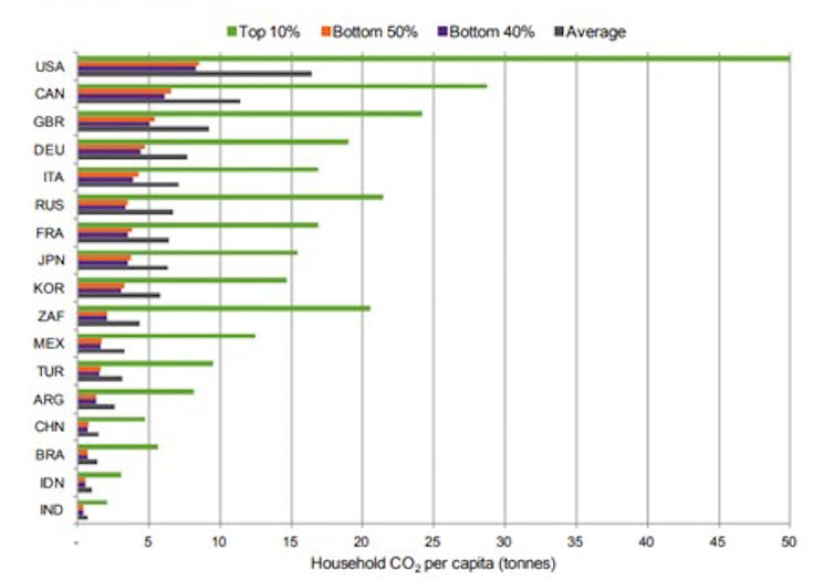 Au niveau des individus, l’organisation non gouvernementale Oxfam avait estimé en 2015 que les 10 % les plus riches sont responsables d’environ la moitié des émissions de CO2 liées à la consommation. Si l’on regarde les individus à l’échelle globale, les écarts s’avèrent encore plus saisissants car, toujours d’après l’étude Oxfam, les émissions-consommations liées au style de vie des plus riches Américains sont 10 fois plus importantes que celles des plus riches Chinois.