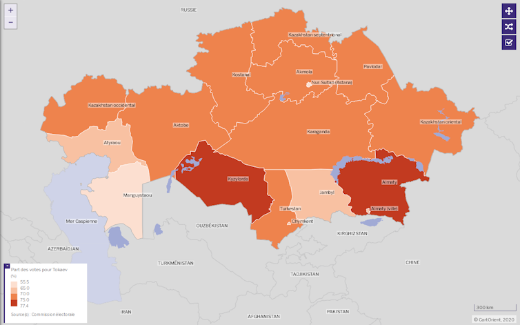 Election présidentielle au Kazakhstan – 2019. Part des votes en faveur de Kassym-Jomart Tokaev (régions, 2019).