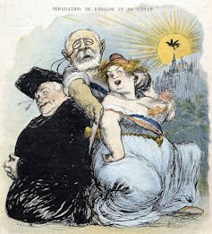Caricature du journal satirique français Le Rire au sujet de la loi « chirurgicale » de 1905 sur la séparation de l’Église et de l’État. Charles Léandre/Wikimedia