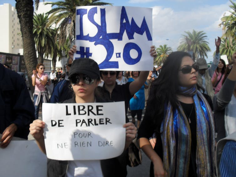 Des manifestants tunisiens s’affrontent sur la question du rôle de l’islam dans leur nouvelle société, en octobre 2011. Magharebia/Flickr, CC BY-SA