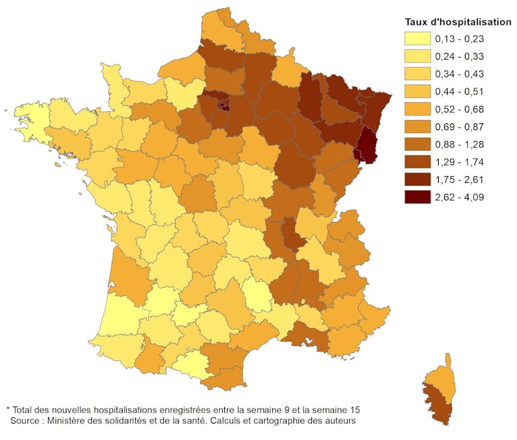 La publication en ligne des données sur la répartition géographique du nombre de cas de Covid-19 nécessitant une hospitalisation et du nombre de décès liés à ce virus (ministère des Solidarités et de la Santé) ainsi que celles des décès quotidiens à l’hôpital (Insee) a permis de rapidement dresser le portrait des départements français. Les cartes suivantes rendent compte de l’hétérogénéité spatiale, très tôt décelée par le secteur médical, de la maladie.