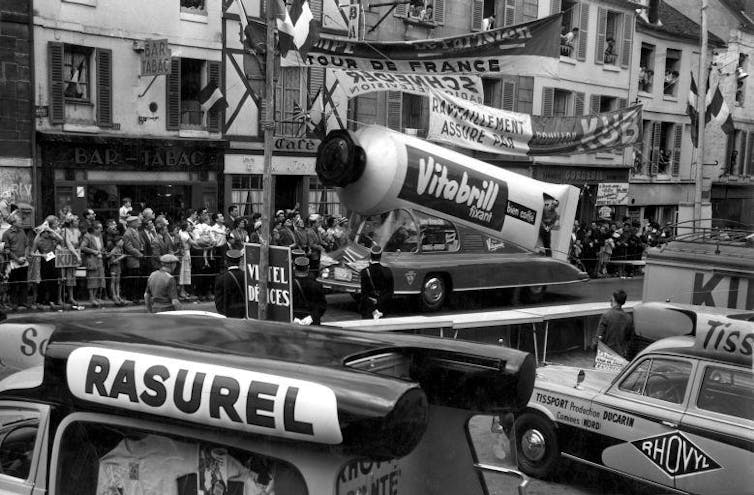 Au-delà de la course, on notera que le Tour construit lui-même du patrimoine économique. Par la Caravane Publicitaire créée en 1930, véritable carnaval qui précède le peloton et distribue quantité d’objets promotionnels au public, par la publicité sur les maillots également, il a participé à l’affirmation de grandes marques nationales comme Peugeot, Ricard, Meunier…