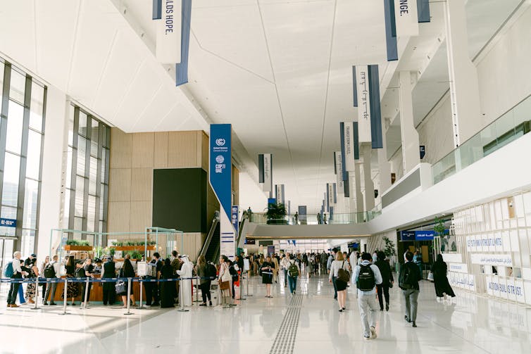 L’entrée dans l’espace de conférences de la COP28 le 1ᵉʳ décembre, à Dubaï. Organisation internationale du travail (OIT), CC BY-NC-ND