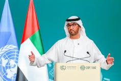Le sultan Ahmed al Jaber, président de la COP28, s'exprimant le 30 novembre lors de l'ouverture du sommet. Présidence de la République du Bénin, CC BY-NC-ND
