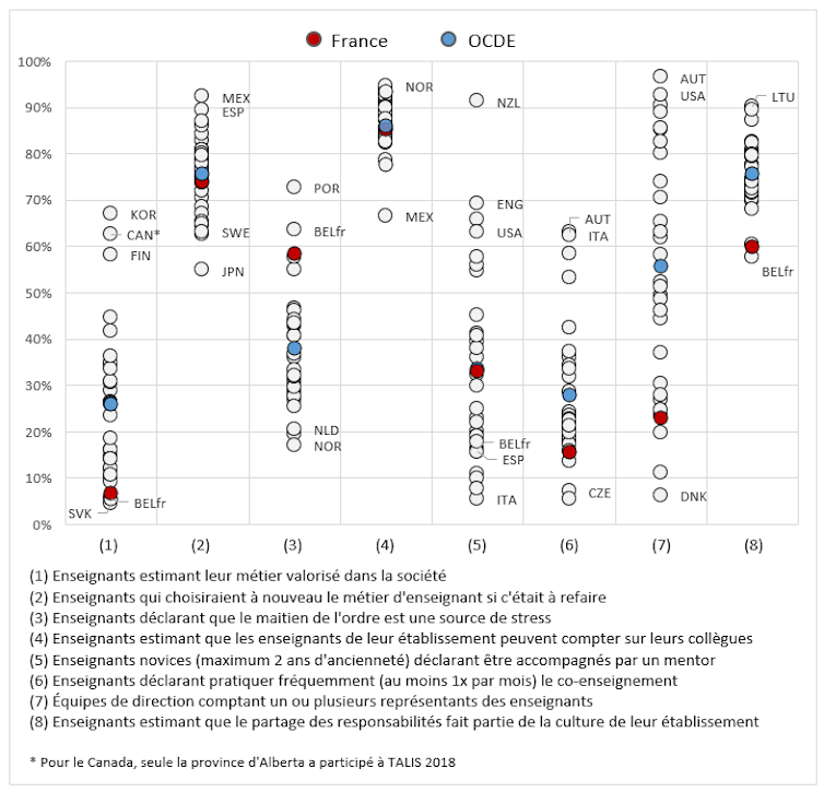 En France, cette solitude est d’autant plus marquée que les enseignants ne se sentent pas du tout portés par une reconnaissance de leur profession dans la société. Avec la Communauté française de Belgique, il s’agit de l’un des systèmes éducatifs où ce déficit de reconnaissance est le plus prononcé. C’est ce que montre l’enquête TALIS.