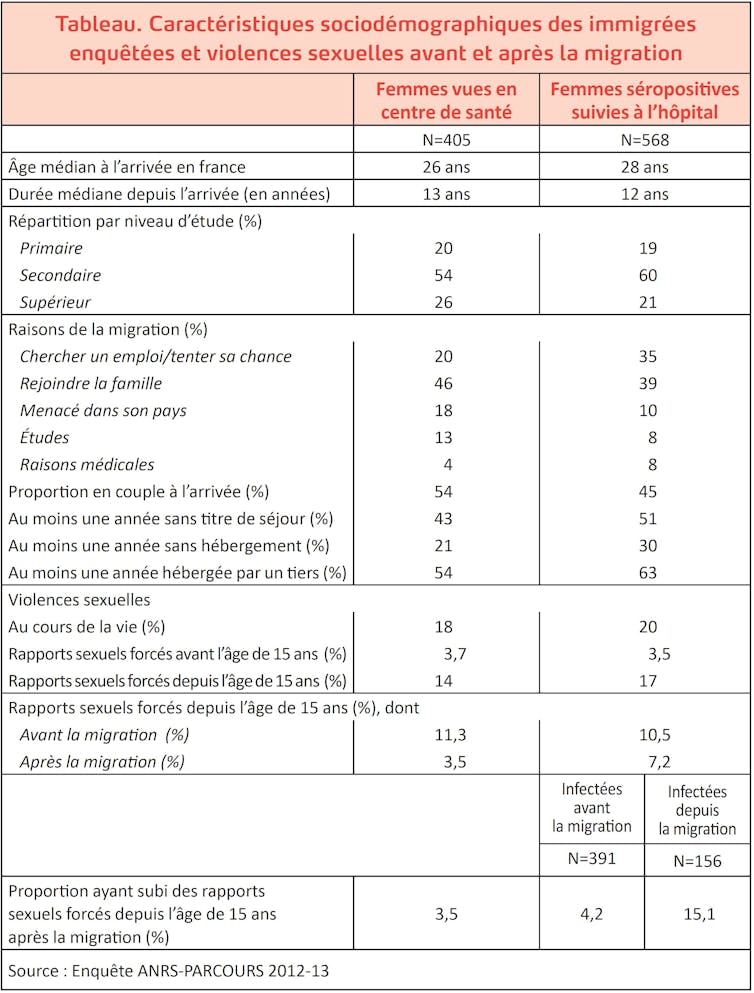 Les femmes infectées par le VIH après leur migration rapportent 4 fois plus souvent avoir été victimes de rapports sexuels forcés après la migration que les femmes non infectées (15 % versus 3,5 % ; tableau).