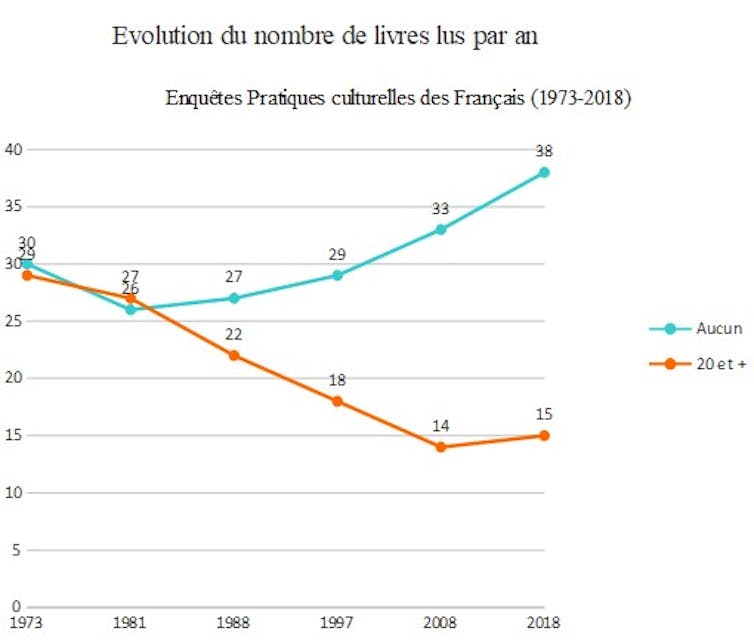 Mais l’allongement continu de la scolarité tout comme l’accroissement systématique de l’offre de bibliothèques publiques n’auront pas empêché la remontée constante de la part de la population qui déclare n’avoir lu aucun livre dans l’année. Et les chiffres de 2018 marquent même une accentuation de ce recul du livre papier dans la population avec un niveau jamais atteint (38 %). L’évidence du geste de la lecture s’amenuise.