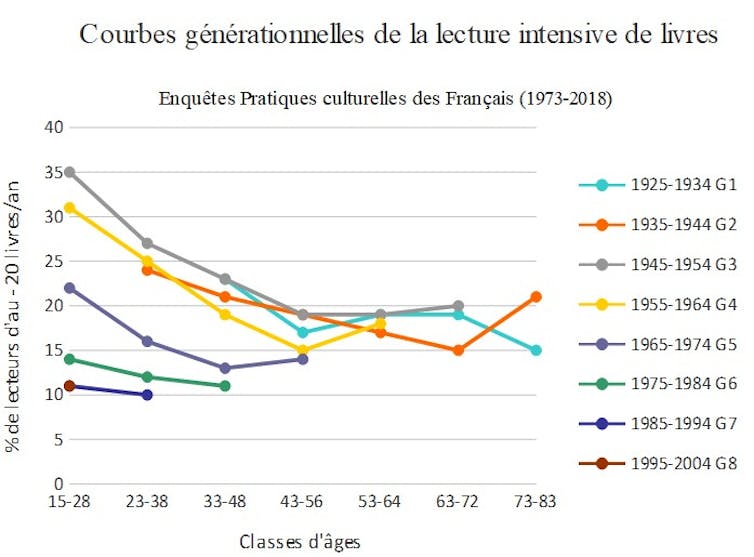 Lors de la première enquête en 1973, les membres de la génération 1 (1925-1934) et 2 (1935-1944) étaient déjà trop âgés pour qu’on ait pu mesurer leurs pratiques de lecture quand ils avaient entre 15 et 28 ans. Mais, de la génération 3 (1945-1954) à la génération 7 (1985-1994), on constate que chaque nouvelle génération de jeunes déclarait lire moins que la précédente. On est ainsi passé de 35 % de lecteurs intensifs chez les premiers baby-boomers à 11 % pour la génération de leurs petits-enfants. On a donc bien assisté à un recul générationnel de la lecture intensive de livres.