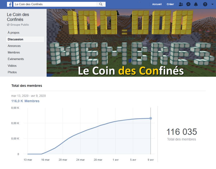 Depuis le début du confinement, de nouveaux groupes Facebook ont vu le jour. C’est le cas par exemple des groupes « Covid-19 : Groupe Entraide et Solidarité Dordogne » ou « Le Coin des confinés ». Ces rassemblements, qui comptent plus ou moins de membres, se positionnent comme des groupes d’entraide, de solidarité ou de partage pour faire face à la situation exceptionnelle que vivent les populations. Le groupe « Le coin des confinés » a vu son nombre de membres s’envoler au cours des premiers jours du confinement.