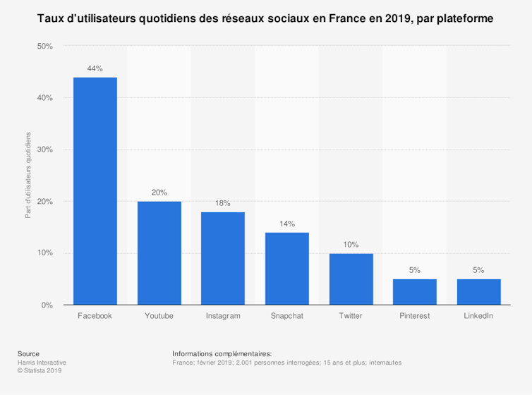 Le géant américain Facebook a annoncé que son activité avait augmenté comme jamais. Fin 2019, Facebook comptait 37 millions d’utilisateurs actifs chaque mois en France et selon Harris Interactive, Facebook était le réseau social le plus populaire en France avec 44 % d’utilisateurs quotidiens (loin devant YouTube et Instagram).