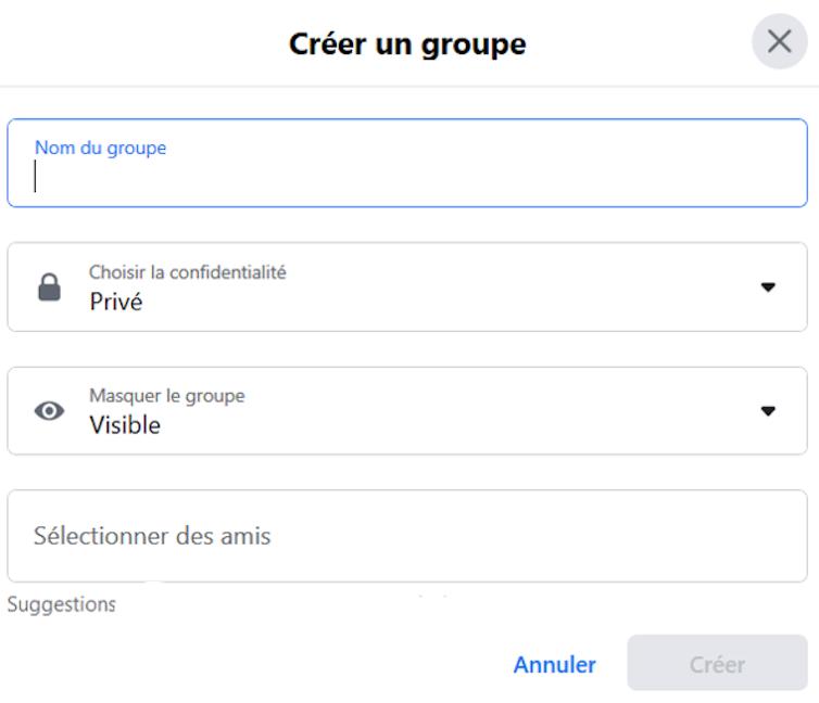 Sur Facebook, n’importe qui (un individu, une entreprise, une association…) peut créer un groupe depuis la page d’accueil (appelée News feed). Il suffit de cliquer en haut à droite de la page sur l’icône « + » et de choisir le module « groupe » pour faire apparaître une fenêtre permettant la création et la mise en place des paramètres d’un nouveau groupe.