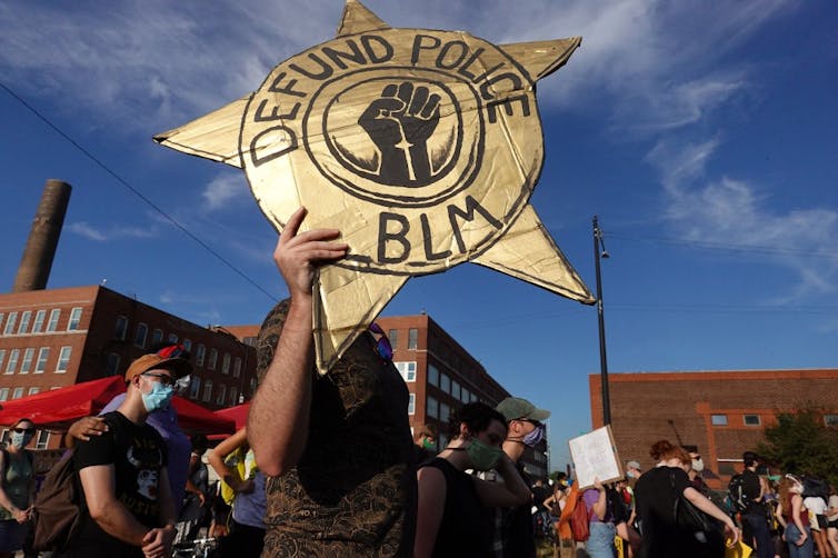 Le slogan « defund the police » a parfois été brandi lors des manifestations Black Lives Matter, comme ici à Chicago le 24 juillet. Scott Olson/AFP
