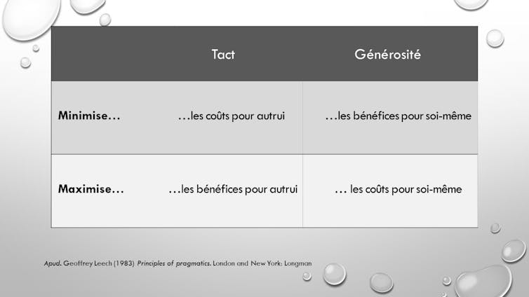 Leech a aussi synthétisé la politesse en six maximes. Les deux premières concernent l’usage des formules directives, tels les impératifs, qu’il vaut mieux, sinon éviter, du moins employer avec tact et générosité :