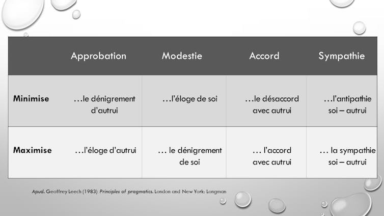 Au lieu d’affirmer, par exemple, « je n’aime pas son travail », la maxime de l’Approbation nous recommande une formule plus positive (« je préfère plutôt… »), tandis que la maxime de la Modestie conseille de se mettre soi-même en cause (« je n’ai pas trouvé le temps d’approfondir son travail »).