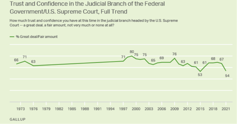 Parallèlement, comme le montre un sondage Gallup, un nombre croissant d’Américains considère que la Cour est trop conservatrice, et seuls 40 % des habitants du pays approuvent son action de la Cour, ce qui représente « l’opinion la plus mauvaise que l’institut ait mesurée dans ses sondages sur la Cour dans les deux dernières décennies ».
