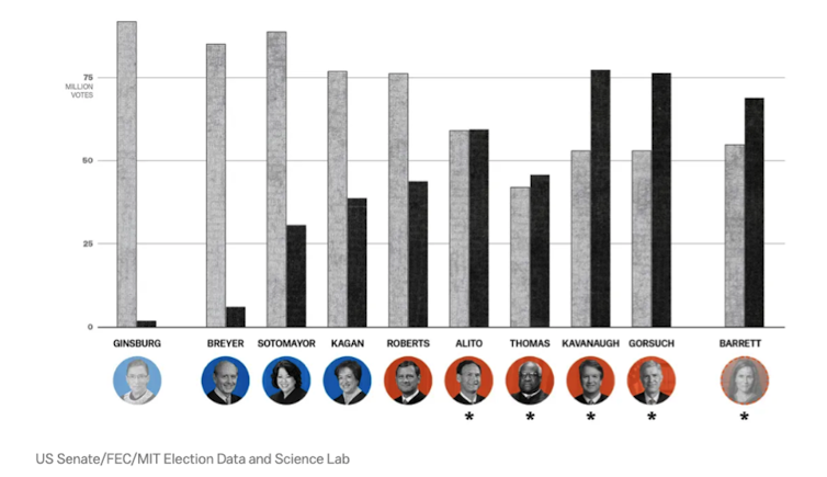 En fait, sur les six juges conservateurs de la Cour suprême, les cinq qui sont les plus susceptibles de remettre en cause Roe v. Wade sont des « juges minoritaires », comme on le voit sur le graphique suivant (en gris le vote positif de confirmation par nombre, et en noir le vote négatif).