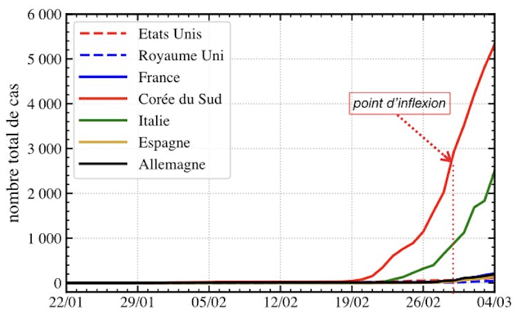 La simple comparaison du nombre de cas entre les pays à un instant donné donne l’impression trompeuse qu’ils sont très inégalement touchés (avec l’échelle linéaire habituelle, figure 3, à la date du 4 mars). C’est faux. La seule véritable différence, en réalité, porte sur le moment où l’épidémie a débuté. L’évolution initiale est similaire et explosive dans presque tous les pays concernés à quelques nuances et exceptions près. Nous sommes très loin des relations linéaires (« de proportionnalité ») qui sous-tendent l’essentiel de notre expérience quotidienne.