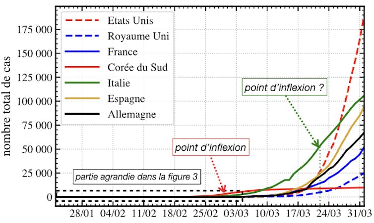 Le premier signe qui importe, maintenant, est que le nombre de nouveaux cas quotidiens augmente de moins en moins vite. C’est ce qui se profile sur la figure 2 pour quelques pays, dont la France. L’épidémie y serait donc déjà sortie de son régime exponentiel initial. L’étape suivante sera de confirmer que l’on a bien atteint un point d’inflexion, en voyant le nombre de nouveaux cas quotidiens diminuer continûment.