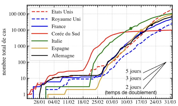 Ce caractère n’est pas intuitif, même pour des scientifiques, car il se manifeste dans relativement peu de phénomènes naturels en dehors du vivant. On peut tout de même l’exprimer de manière à la fois simple et frappante, en parlant du temps qu’il faut au nombre de cas pour doubler. Avant les premières mesures sérieuses de prévention, le nombre de cas doublait en 2 à 4 jours dans la plupart des pays occidentaux (figure 2). Dans ces conditions explosives, il est multiplié par 1000 en un mois (doublement tous les 3 jours). Si nous n’avions rien fait, à la fin avril la France aurait sans doute compté des centaines de milliers de victimes, voire un million !