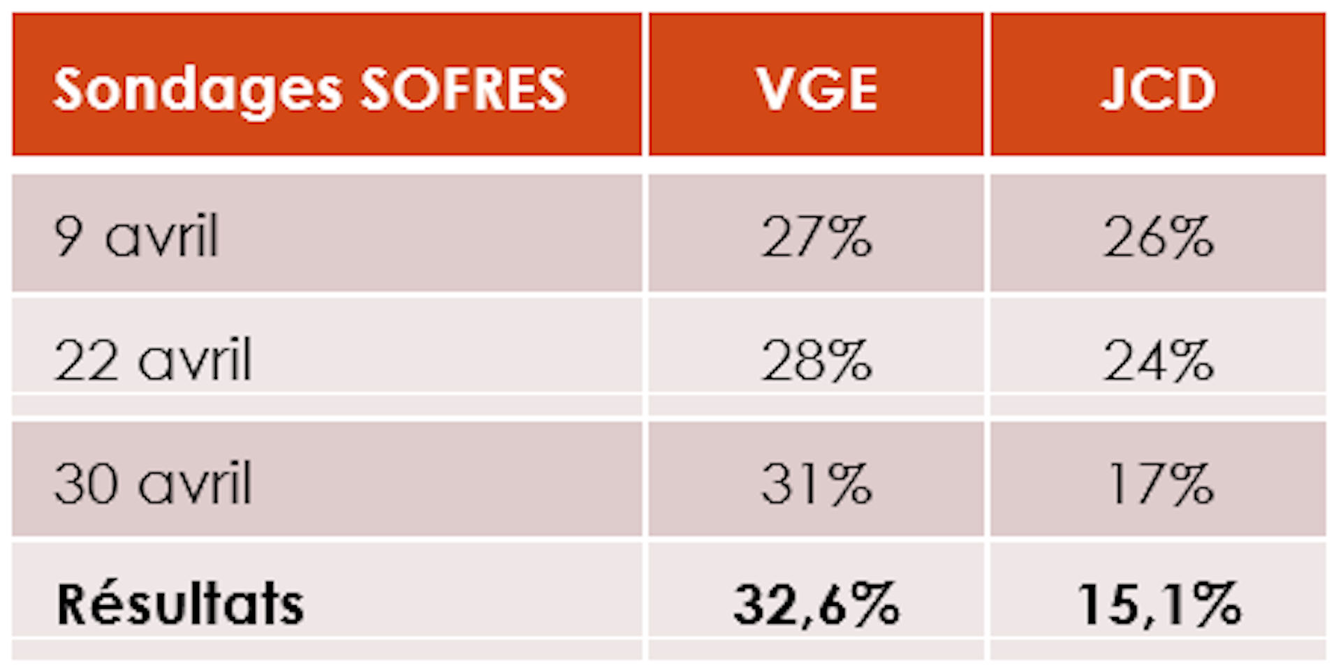 En 1974, au premier sondage de l’élection présidentielle, Valéry Giscard d’Estaing devance Jacques Chaban-Delmas de seulement un point.