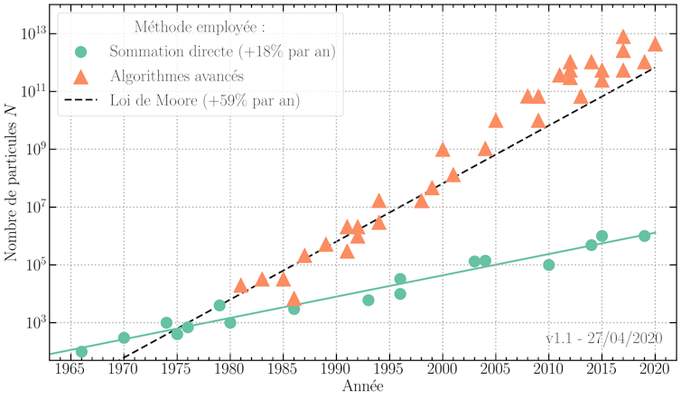Afin de réduire le coût numérique des simulations, l’essentiel du travail en cosmologie numérique depuis 1980 a consisté à améliorer les algorithmes. Le but recherché était de s’affranchir du calcul explicite de toutes les interactions gravitationnelles entre particules, notamment pour les paires qui sont les plus éloignées dans le volume à simuler. Ces développements algorithmiques ont permis une augmentation gigantesque du nombre de particules utilisées dans les simulations cosmologiques, en orange sur la figure 1. Et de fait, depuis 1990, l’augmentation des capacités de calcul en cosmologie a été plus rapide que la loi de Moore, les améliorations logicielles s’ajoutant à l’augmentation de la performance des ordinateurs !