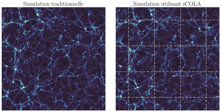 Afin de minimiser les calculs numériques inutiles, nous utilisons un algorithme de simulation hybride (sCOLA) : analytique aux grandes échelles et numérique aux petites échelles, où les interactions à 𝑁 corps sont importantes. L’idée sous-jacente est habituelle en physique, il s’agit d’un « changement de référentiel » : la dynamique à grande échelle est prise en compte par le nouveau référentiel, tandis que la dynamique à petite échelle est confiée à l’ordinateur qui la résout par des calculs classiques du champ de gravité.